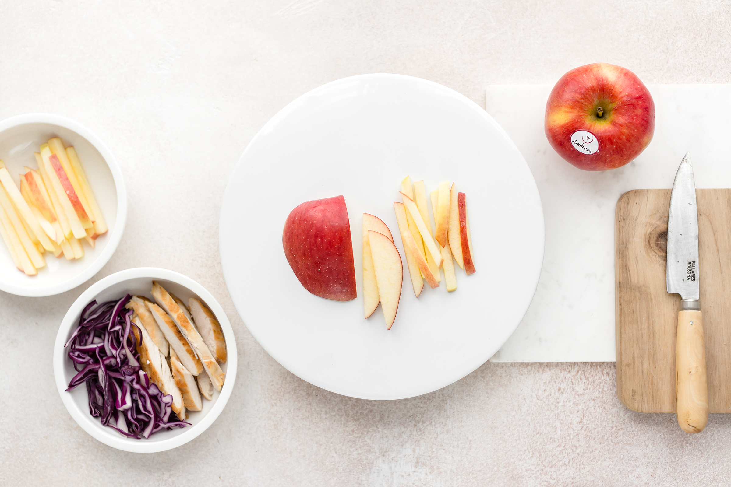 Tagliate a listarelle il pollo, il cavolo cappuccio e la mela.