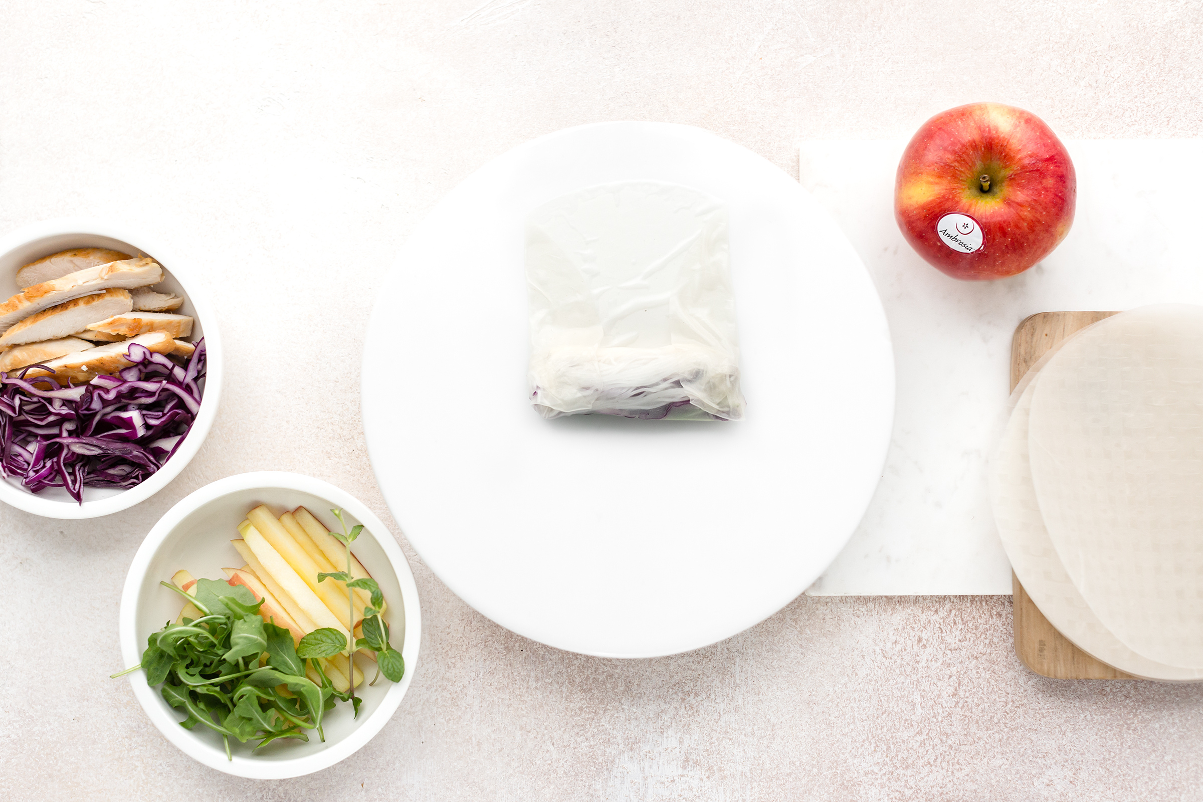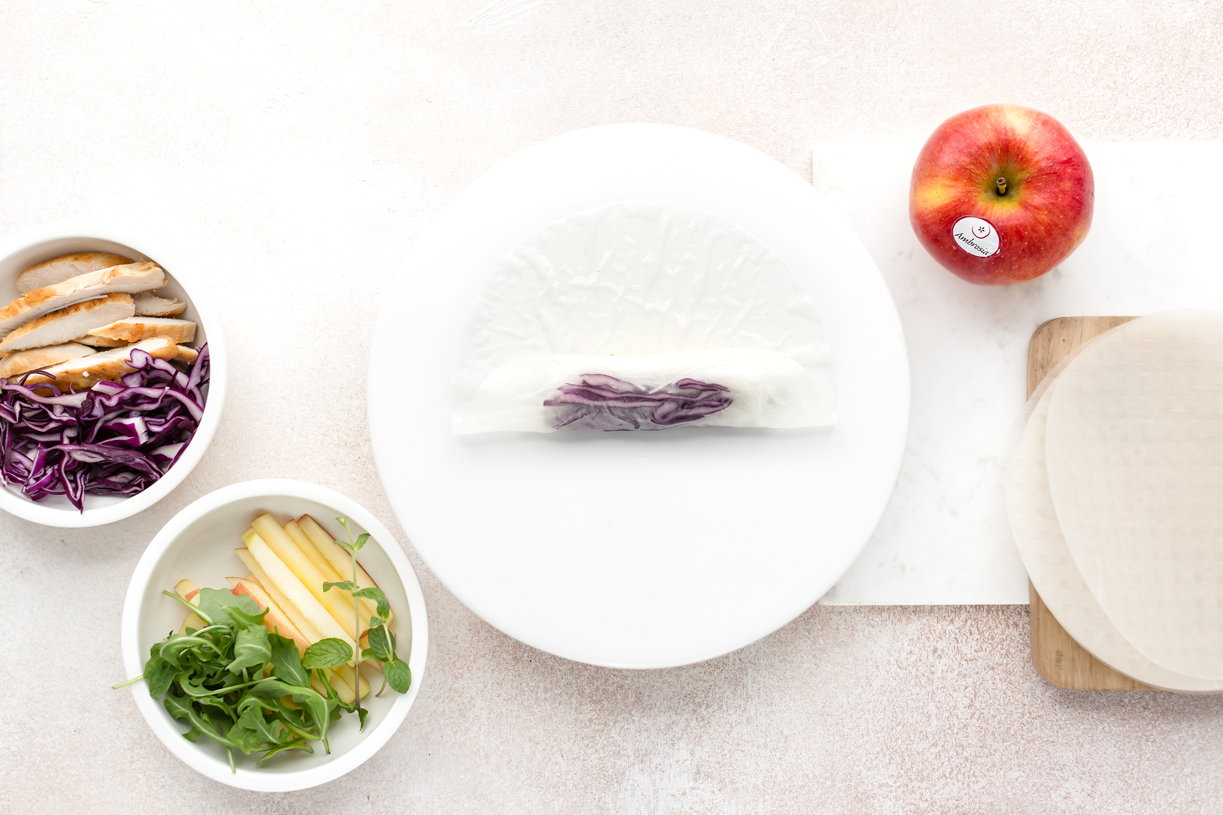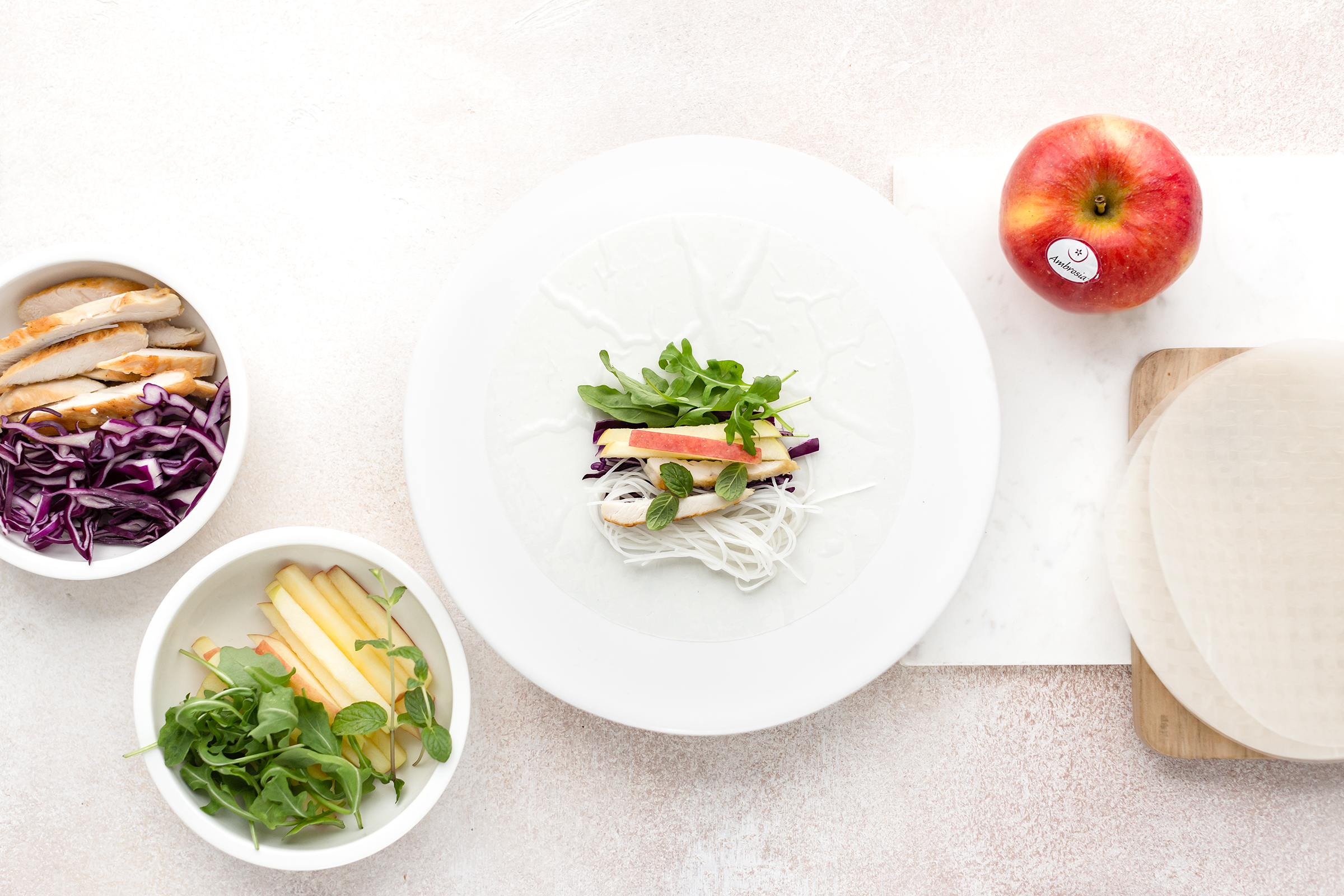 Bagnate una sfoglia di riso, immergendola completamente nell’acqua per pochi secondi. Adagiatela subito sul tagliere e farcitela con il ripieno: un po’ di spaghetti di riso, di cavolo cappuccio, di rucola, di pollo, un po’ di mela e qualche fogliolina di menta.